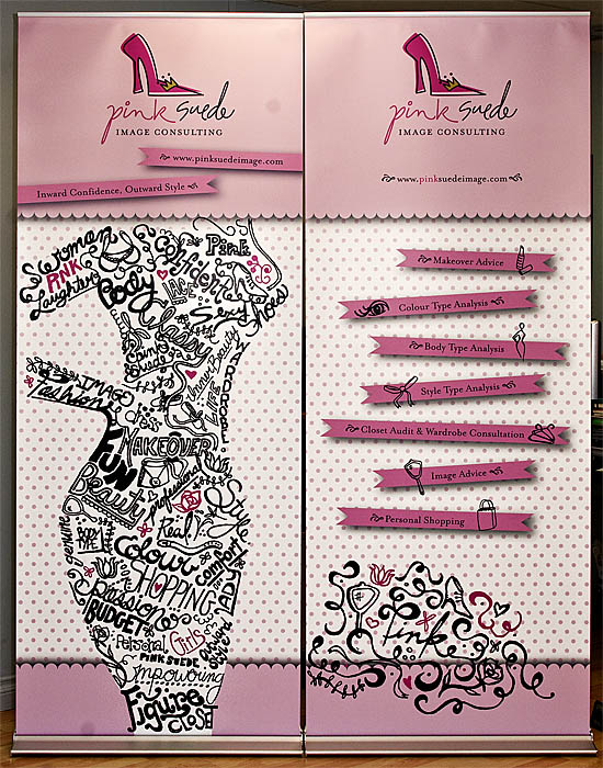We recently completed two tradeshow banners for Pink Suede Imaging. They turned out so wonderful I felt the need to blog. Pink Suede is a service that assists women in the area of personal image. Think of them as the What Not to Wear of Red Deer. If Clint & Stacy came to pay a visit I think they would be rather pleased. An awesome opportunity for central Alberta women to step-up their confidence.