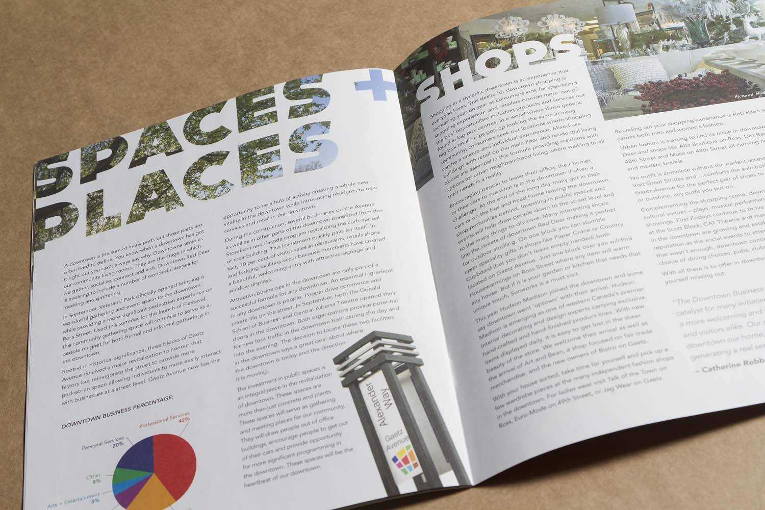 Photographs of downtown locations and business owners are presented alongside the success stories they relate to. For longer stories, headlines are cropped into them as a space saver and to add a little visual flair, while photos are displayed more naturally where space allowed. This mixture creates an interesting visual tempo to keep the viewer engaged.